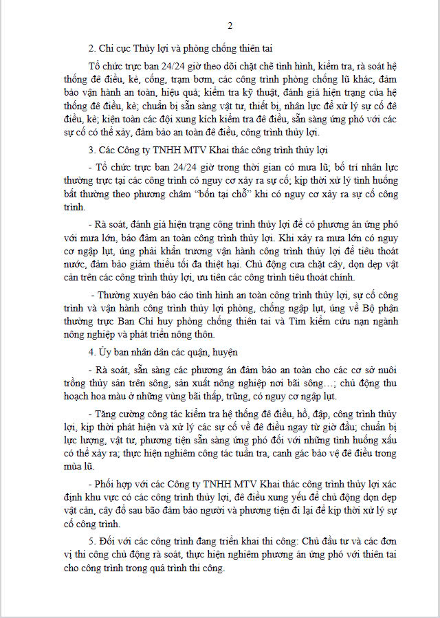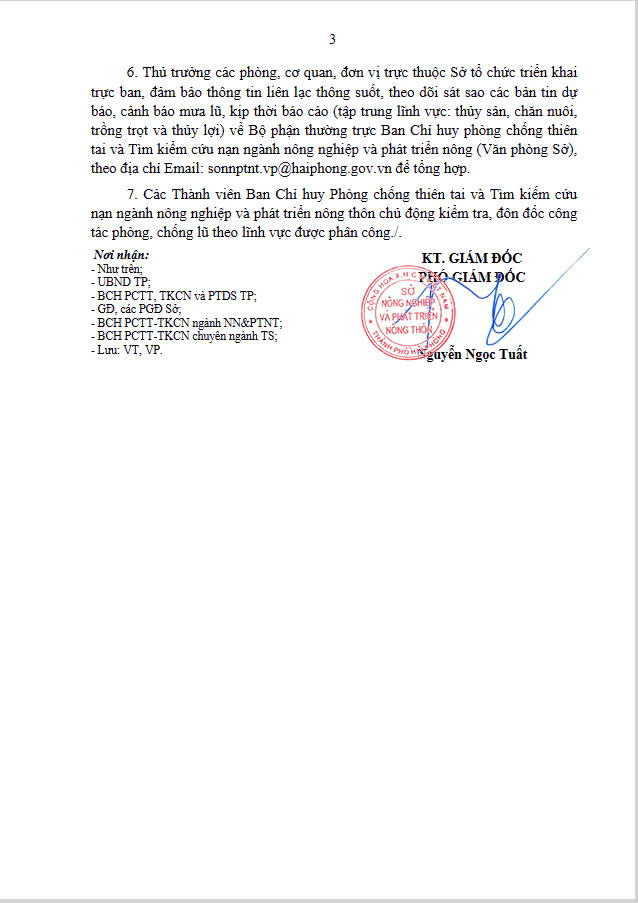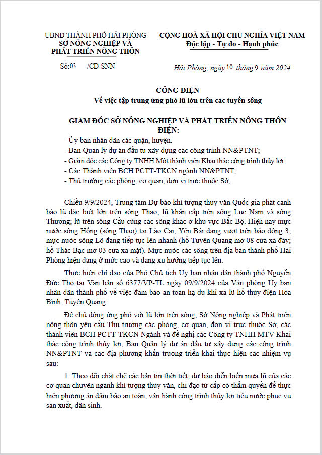 Công điện của sở nông nghiệp và phát triển nông thôn thành phố hải phòng về việc tập trung ứng phó lũ lớn trên các tuyến sông.